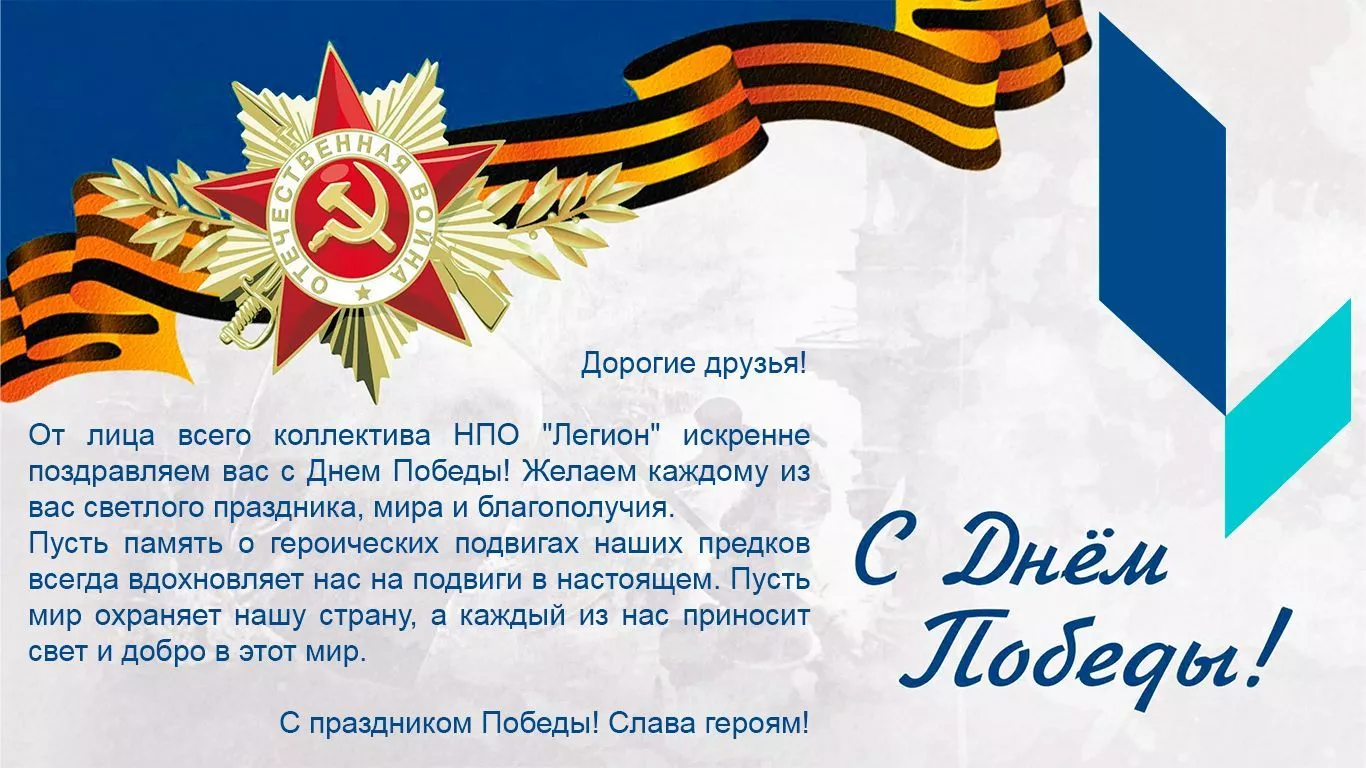 Поздравляем Вас с этим великим праздником! Пусть мир и благополучие пребывают в наших сердцах, а гордость за наше прошлое и вера в светлое будущее всегда будут сиять в наших душах. С праздником Победы!